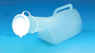 Orinal tipo botella con mango. Calibrado exteriormente para registrar la capacidad. Resistente, fácil de llevar y puede ir en autoclave.
