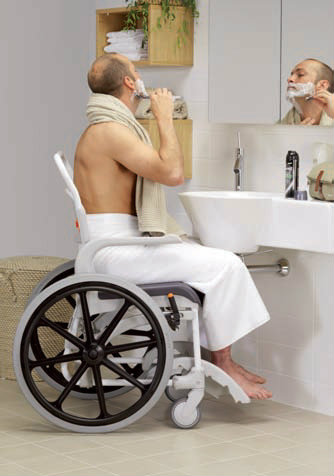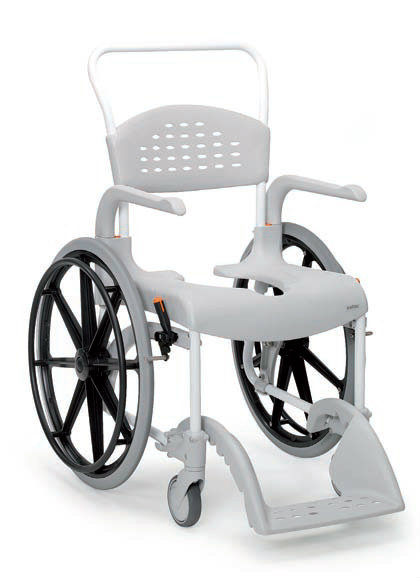 Una silla de ducha bien equilibrada y fácil de maniobrar. Las ruedas de 600 mm permiten que el usuario impulse la silla, obteniendo una mayor independencia durante la higiene personal.<br />