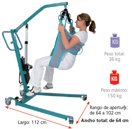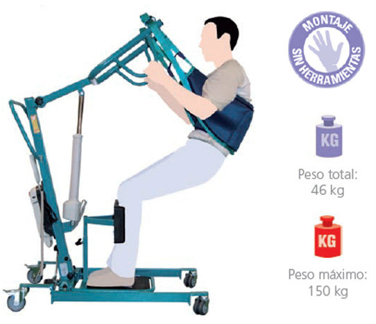 Para convertir la grúa sólo debemos cambiar la pieza del mástil que nos permitirá adaptar un arnés A909 para levantar el paciente por debajo de los brazos. Una plataforma encajada en la parte inferior de la grúa servirá de soporte para los pies y las rodillas.