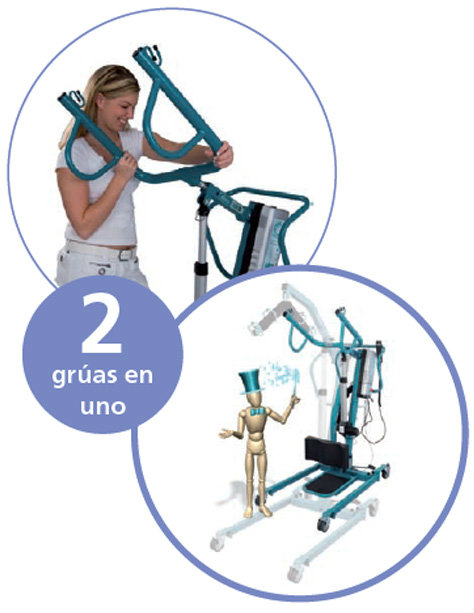 <strong>AD913 - DUO DOS GR&Uacute;AS EN UNA</strong><br /> <br /> En s&oacute;lo 30 segundos podemos convertir la gr&uacute;a electr&oacute;nica convencional en una gr&uacute;a bipedestaci&oacute;n cambia pa&ntilde;ales, y todo sin necesidad de herramientas.<br /> <br /> Nueva equipaci&oacute;n electr&oacute;nica alemana, que permite tener una estaci&oacute;n externa de carga con una bater&iacute;a completamente cargada y lista para su uso.<br /> <br /> Para convertir la gr&uacute;a en una cambia pa&ntilde;ales solo hay que cambiar una pieza del m&aacute;stil y colocar la plataforma reposapi&eacute;s, todo ello sin necesidad de herramientas.<br /> <br /> Para convertir la gr&uacute;a s&oacute;lo debemos cambiar la pieza del m&aacute;stil que nos permitir&aacute; adaptar un arn&eacute;s A909 para levantar el paciente por debajo de los brazos. Una plataforma encajada en la parte inferior de la gr&uacute;a servir&aacute; de soporte para los pies y las rodillas.<br />